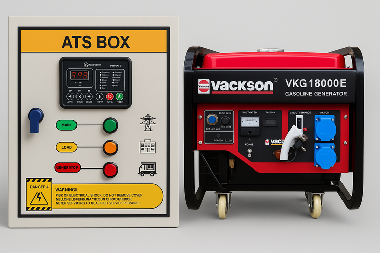 پکیج تابلو ATS و ژنراتور بنزینی Vackson VKG18000E یک سیستم کامل برای تأمین برق اضطراری در زمان قطع برق شهر است. این مجموعه شامل تابلو برق اتوماتیک (ATS Box) و ژنراتور قدرتمند Vackson میباشد که بهصورت خودکار برق را بین شبکه اصلی و ژنراتور سوئیچ میکند.